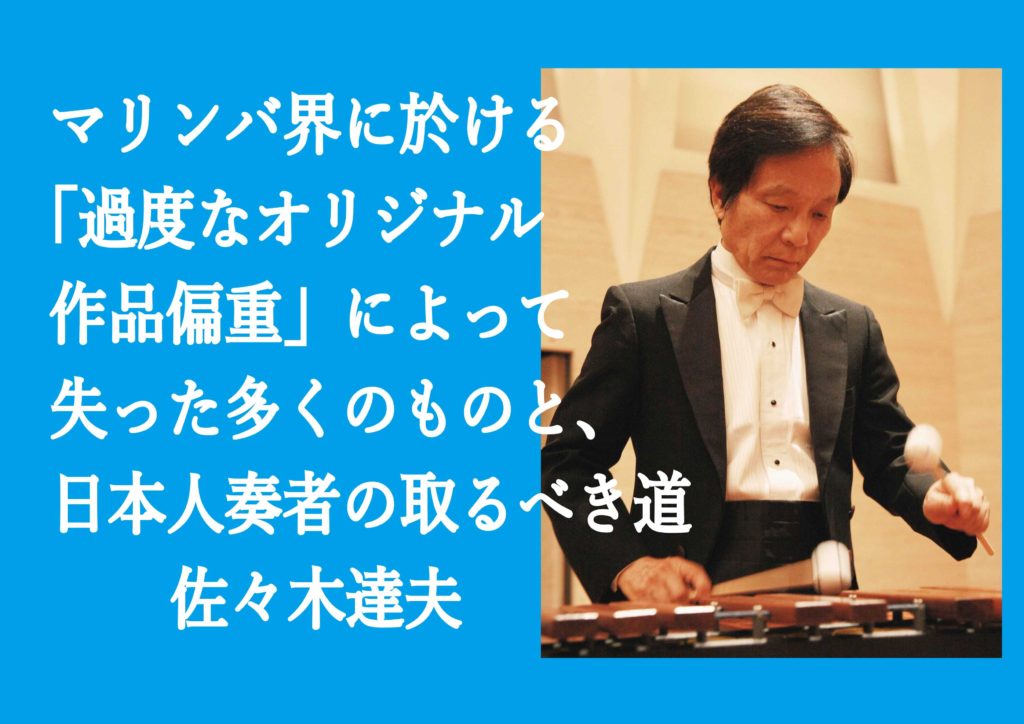 「マリンバ」演奏に関しては、20世紀全般、日本が世界で最も優れていた。アメリカではC.O. Musser 氏の活動以来、マリンバは衰退の一途を辿っていた。そうした状況にもかかわらず、日本の指導者たちは自分たちの生徒をも「世界で認められる」という実(まこと)しやかな目的を掲げ、欧米の標準に適応させて行った。